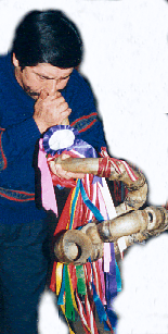 Músico indígena ejecutando el corno andino (waqrapuku) fabricado con varios cuernos de vacunos. El profundo sonido se deja escuchar a grandes distancias, en los cuatro extremos de la ciudad, desde el mes de julio y durante todo el mes de agosto. La ejecución de este instrumento representa el anuncio de la llegada de la Virgen desde el nevado monte Pumahuiri, y una muestra de reverencia y homenaje a la Virgen de los pastores de las zonas altas.